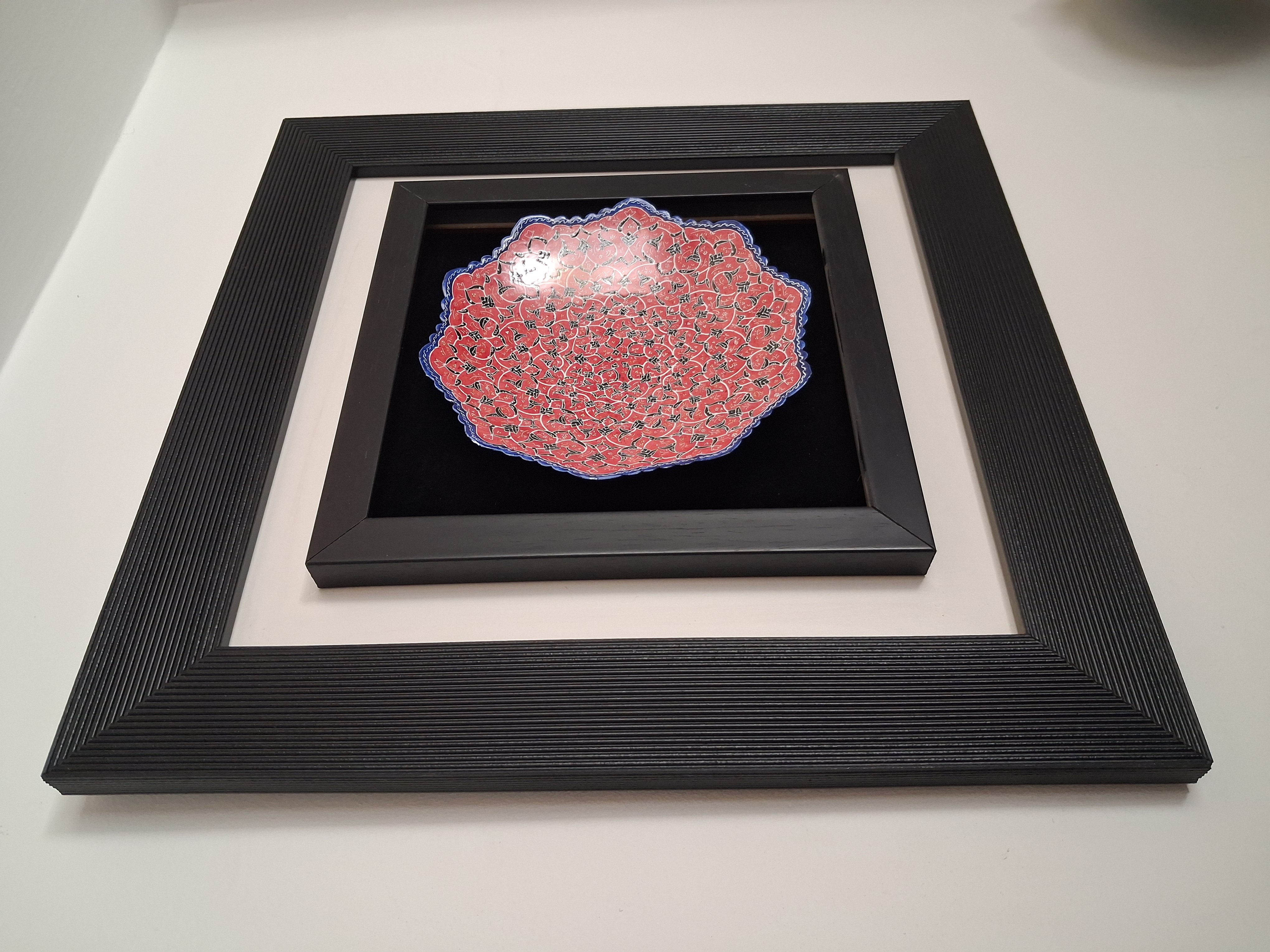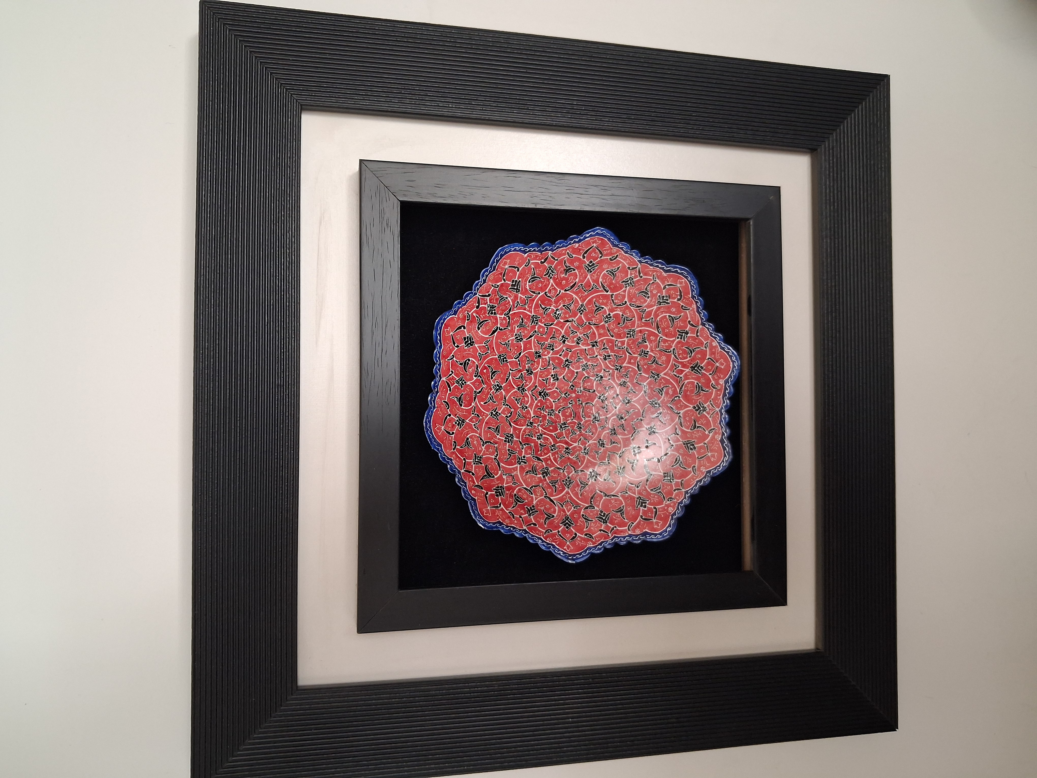 دستهبندی: محصولات vipاندازه بشقاب: ۱۶ سانت قطراندازه قاب : ۳۸در۳۸رنگ و طرح: رنگ قرمز ابی با طرح اسلیمی سنتی
