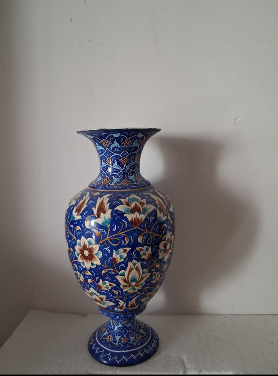 گلدان با فرم کاپ را استاد کار زیر ساخت ساز انجام داده روی مس وبعد از لعاب شدند و کوره رفتند استاد مینا کار طرح اسلیمی سنتی و پرداز را روی ان اجرا کرده وبعد مجدا کوره رفته تا رنگ روی لعاب ثابت شود در اثر حرارت تا ۸۰۰درجه