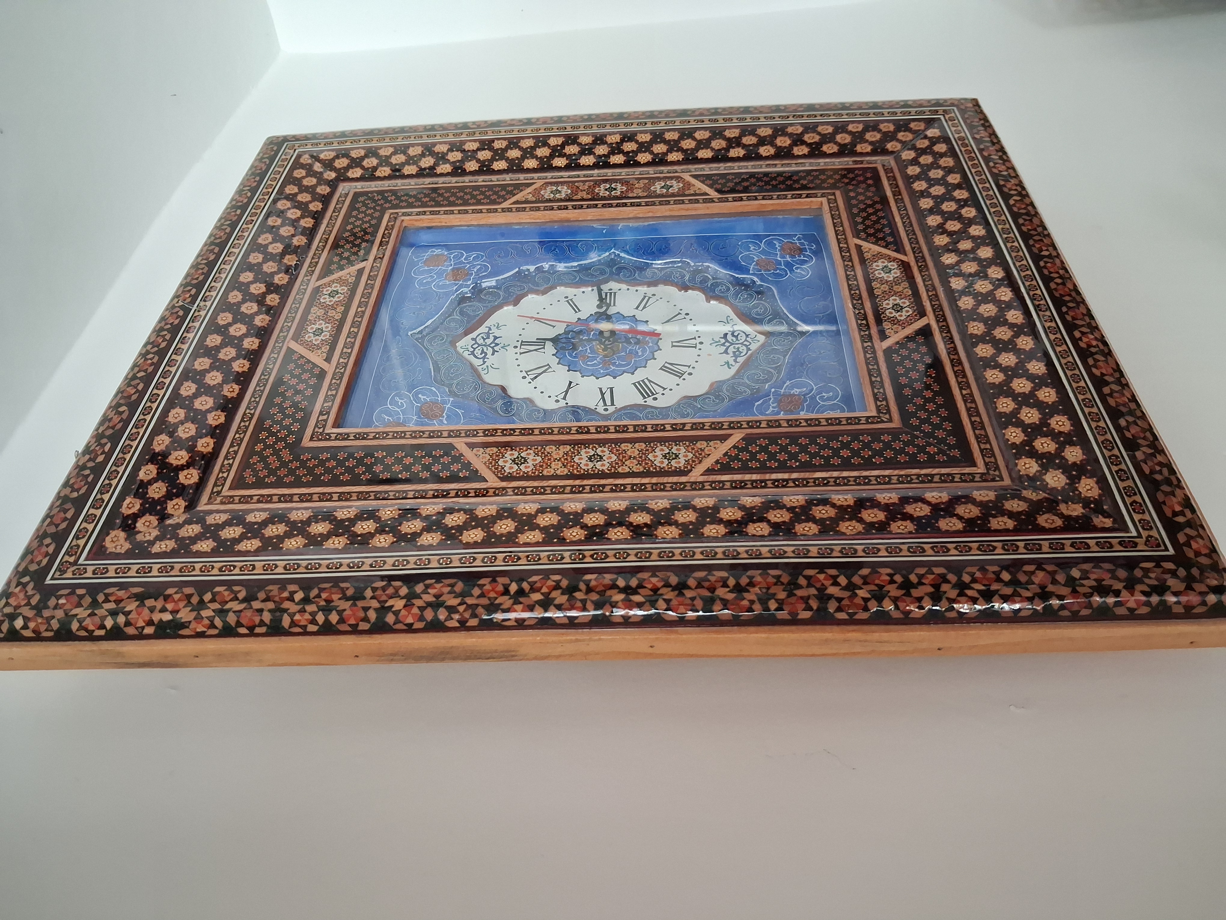 دستهبندی: محصولات قابیاندازه صفحه ساعت: ۱۷در۲۳سانتاندازه قاب خاتم: ۳۸در۴۴سانتجنس صفحه ساعت: مسجنس قاب: چوب بانوع خاتم تخمه ای